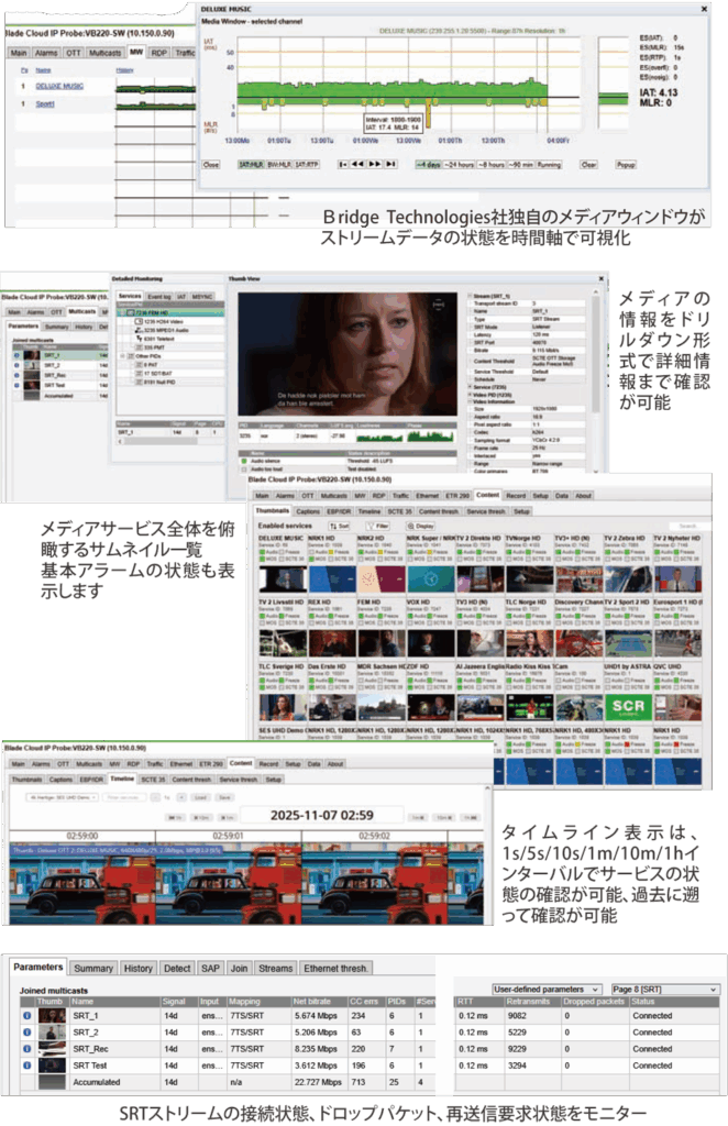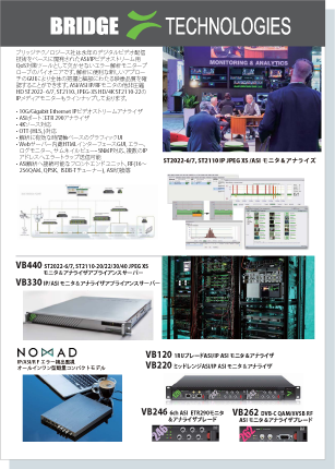 ブリッジテクノロジーズ社は、永年のデジタルビデオ配信技術をベースに開発されたASI/IPビデオストリーム用QoS対策ツールとして欠かせないエラー解析モニタープローブのパイオニアです。 解析に便利な新しいアプローチのGUIにより、全体の把握と細部に渡る映像品質を確認することができます。 ASI/ASI IP/RFモニタの他、非圧縮HD ST2022-6/7, ST2110、JPEG-XS HD/4K ST2110-22のIPメディアモニターもラインナップしています。